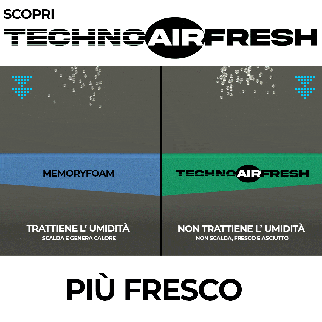 La composizione del  TECHNOAIRFRESH® ha dei vantaggi notevoli, grazie alla struttura a celle aperte di nuova generazione, è traspirante, quindi il sudore e l’umidità non si possono depositare.